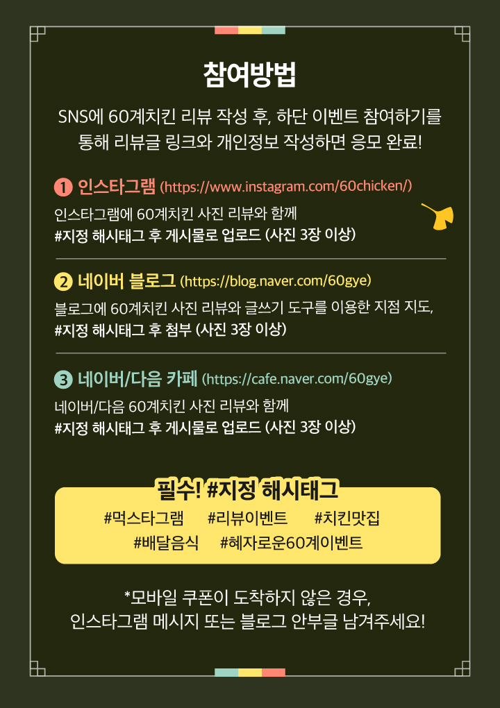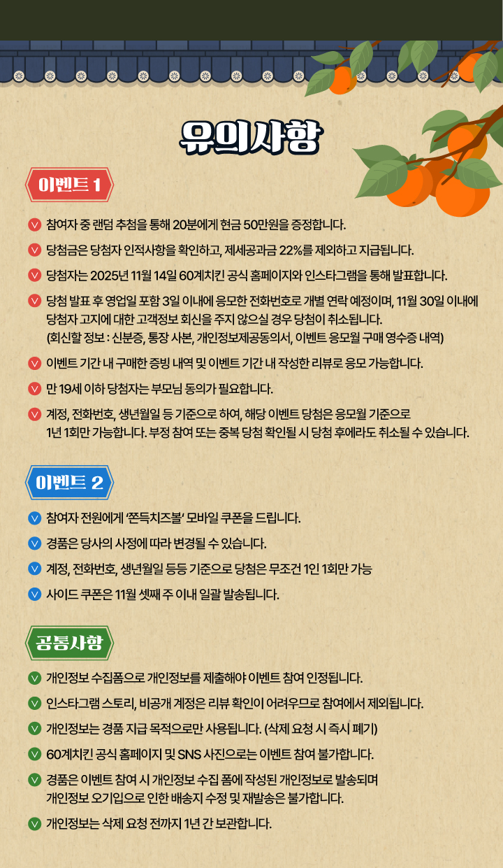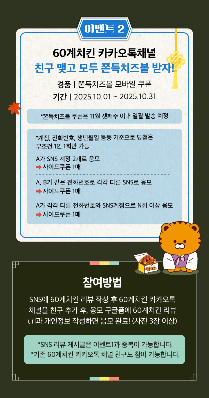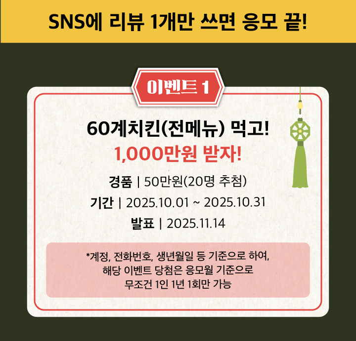 보름달에 소원 빌고 60계치킨 먹으면! 1,000만원 당첨! + 카카오채널 친구 추가하고 쫀득치즈볼 받자! 25년 10월 이벤… 페이지 정보 작성일25-09-24 관련링크 다음글 목록 본문 다음글 목록